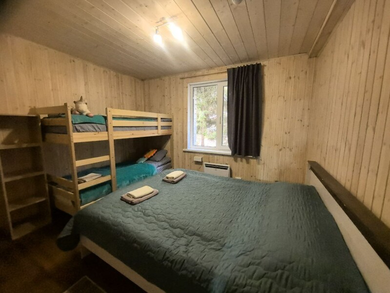 Светлый уютный номер с удобствами: - совмещенный душ+туалет - двуспальная и двухъярусная кровати (подойдет для двух взрослых и двух детей) - прикроватные тумбы, стеллажи - постельное белье - лицевое и банное полотенце для каждого гостя В доступе уютная кухня-гостиная со всем необходимым, с камином, видео-проектором и настольными играми.