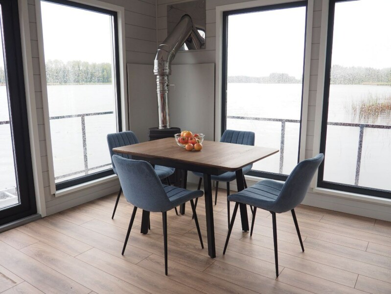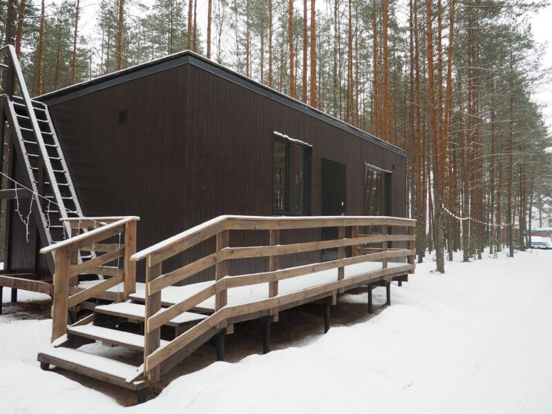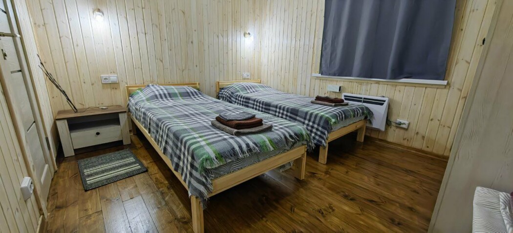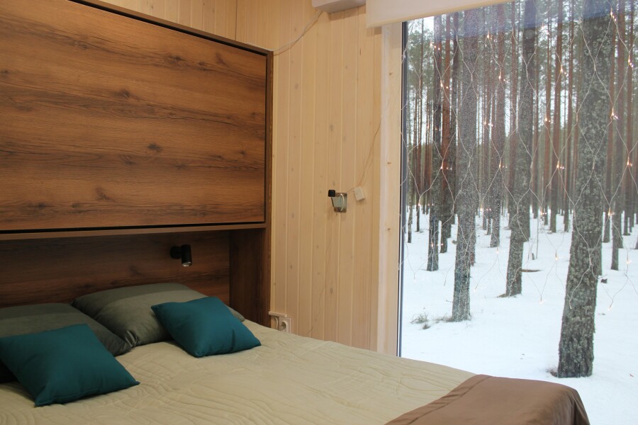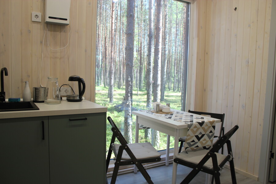 Четыре дома сдаётся на одну компанию до 26 взрослых человек и 4 детей на отдельном месте. В первом доме-отеле 6 номеров, в каждом номере - собственный душ и туалет (совмещенный), кухня-гостиная со всем необходимым для приготовления блюд и сервировки стола, а также экран с проектором, печь-камин и настольные игры. В двух других домах по две спальни, панорамные окна, двуспальные или раздельные кровати на ваш выбор, два санузла, тёплые полы, общая кухня-гостиная, набор посуды и столовых приборов. Ещё одно средство размещения - домик-студия с сауной. В распоряжении гостей большая утеплённая беседка с камином. Есть розетка для зарядки электромобиля.