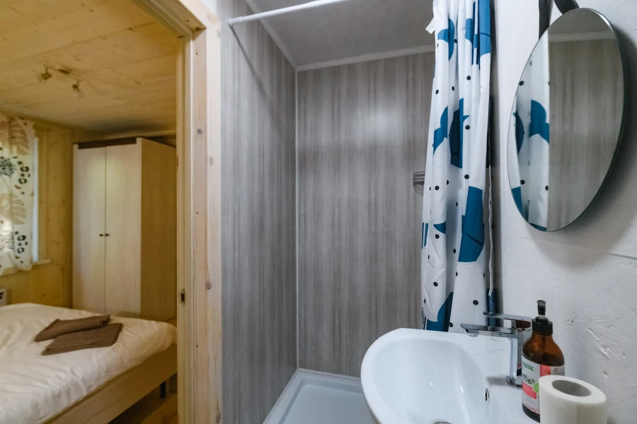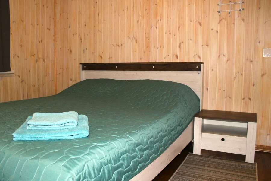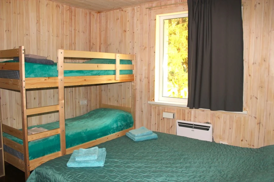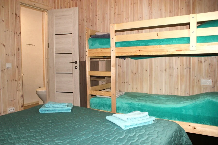 Светлый уютный номер с удобствами: - совмещенный душ+туалет - двуспальная и двухъярусная кровати (подойдет для двух взрослых и двух детей) - прикроватные тумбы, стеллажи - постельное белье - лицевое и банное полотенце для каждого гостя В доступе уютная кухня-гостиная со всем необходимым, с камином, видео-проектором и настольными играми.